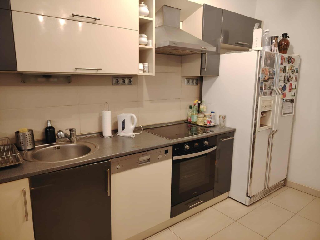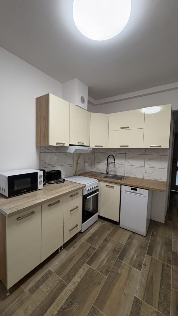 - teljesen felújított konyha , új konyhaszekrény , mosogatógép , tűzhely , mikró , szag elszívó , víz forraló , kenyérpirító